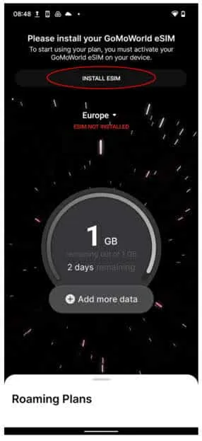 After purchasing your first GoPlan, the GoMoWorld app will direct you to install an eSIM with a dedicated button “INSTALL ESIM”