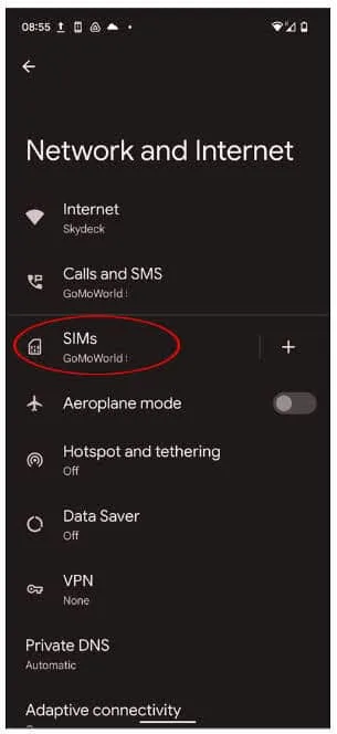 - Tap Network and Internet settings and selects SIMs