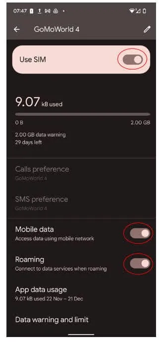 - Turn on Use SIM, Mobile data and Roaming