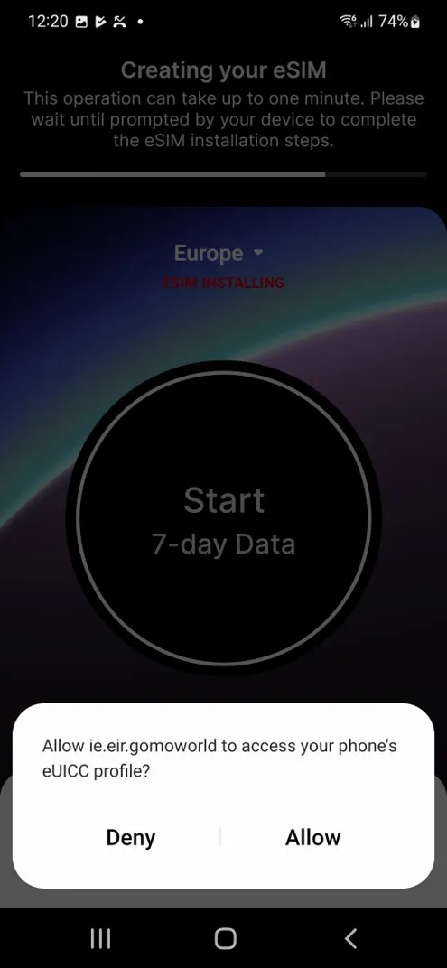 You need to authorize ie.eir.gomoworld to access the eUICC (an eUICC is the approval method required to allow an eSIM to work on your handset) profile on your device.
