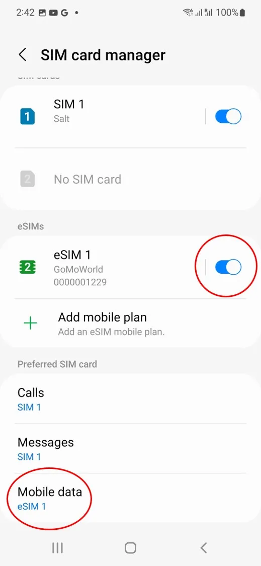 Go to Settings > Connections > SIM card manager and ensure GoMoWorld is toggled on and Mobile Data is configured with GoMoWorld eSIM.