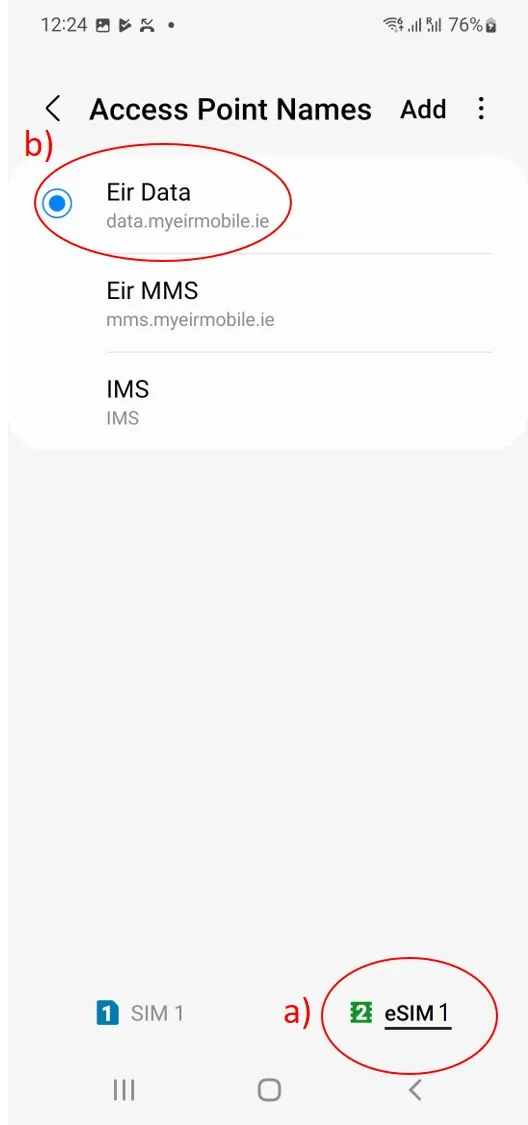 - Go to Settings > Connections > Mobile networks > Access Point Names, select GoMoWorld eSIM (a) on the figure and enable eir Data Access Point Name (b) on the figure