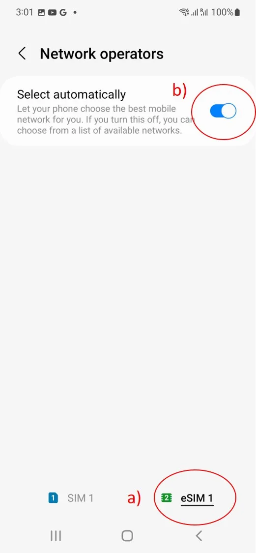 - Go to Settings > Connections > Mobile networks > Network operators, select GoMoWorld eSIM (a) on the figure and toggle on “Select Automatically” (b) on the figure.