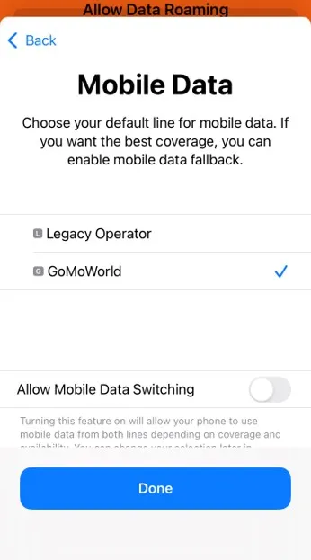 - Select your home number as the default line for Mobile Data if you're still in your home country. If you're already at your destination, you need to choose your GoMoWorld eSIM for Mobile Data