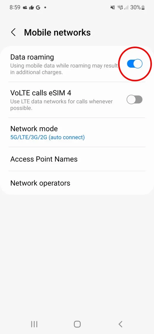 - Toggle Data roaming ON